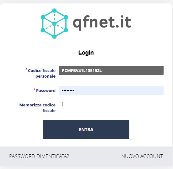 Per effettuare la login è necessario inserire le credenziali personali dell'utente che ha registrato l'azienda (o di un utente abilitato alla sua gestione*) consistenti nel codice fiscale (da non confondere con la partita IVA aziendale) e una password come illustrato nell'immagine sottostante.